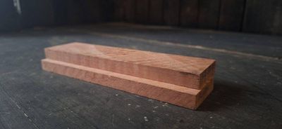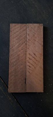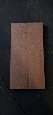 Mirror matched set of knife scales, suitable for forming a knife handle either side of the tang. This wood chosen for its colour and figure. Serviceable as bare wood but better kept oiled to show the grain and figure. Other sets cut from the same piece of wood are listed, those that are close consecutive numbers (either side) and have the same grade may be similar in colour and pattern.