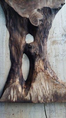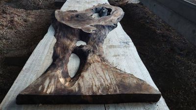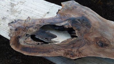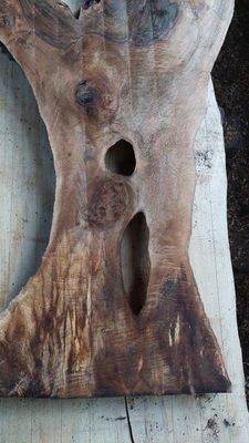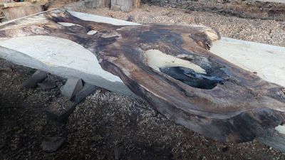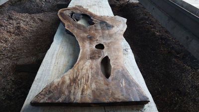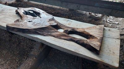 Weirdly shaped Wonderful Wood, Persian Walnut slab, resawn flat, entirely upper face and underside reference points, the slab sitting flat of an even thickness. Air dry at resawing early April 2025, now residing in dry store, presently 11-12%. Suitable for Epoxy or Glass top table, maybe a unique writing desk. A second smaller slab possibly available to mirror match the wider end.