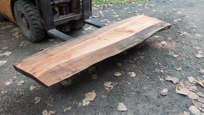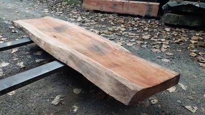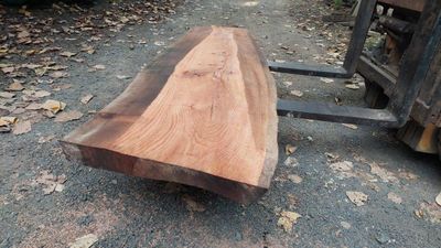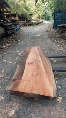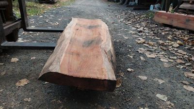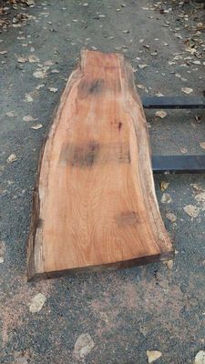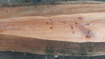 Red Oak slab, very hard and heavy, this slab has experienced high shrinkage, warp cup during air drying. This slab has a defined deep cup in its widest face. It is still quite thick, can be utilized as it is, or later resawing after some time in dry store. The slab is now thoroughly air dry, taken from our air dry shed during the dry autumn days. The slab has now had its first and initial resaw, borer protection applied and placed in dry store to undertake further drying, a means of Kiln Conditioning. A second resaw may be undertaken in consultation with buyer.